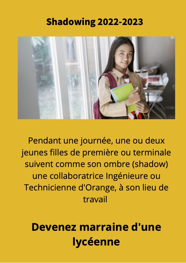 Cette opération consiste à faire rencontrer des lycéennes de Première ou Terminale et des femmes Ingénieures ou Techniciennes d'Orange pendant une journée où la ou les 2 jeunes filles suivent comme son ombre (shadow) la collaboratrice d’Orange, à son lieu de travail. Elles pourront participer à leurs activités, échanger avec elles et répondre à toutes leurs questions tout au long de la journée. Vous pouvez lire la lettre d'invitation aux lycéennes d'Orange ici.