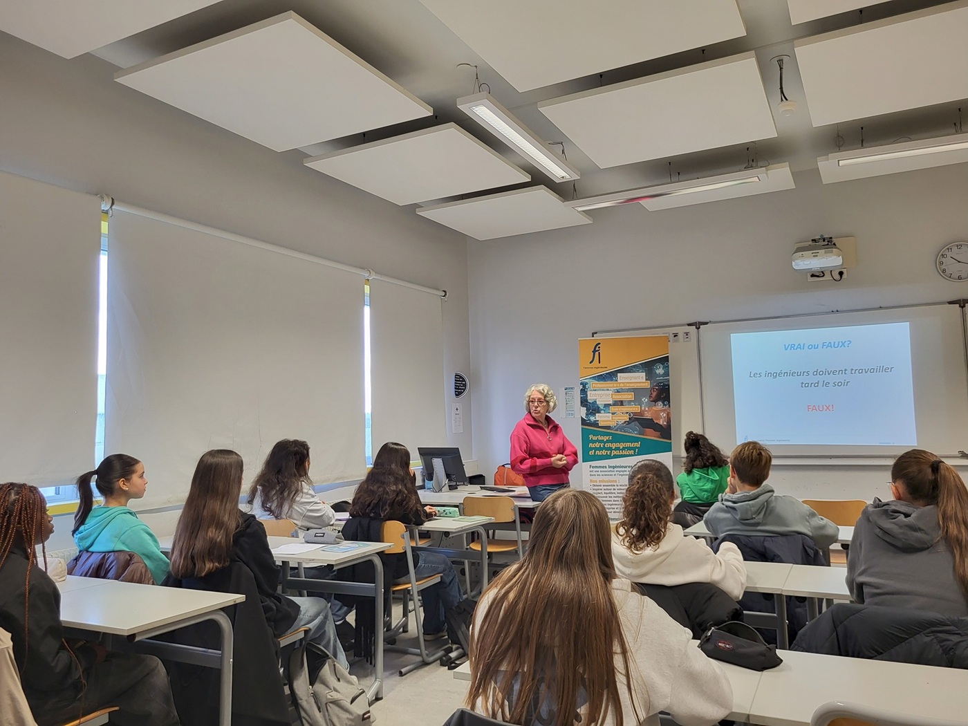 ✨ Deux ingénieures de l'Association Femmes Ingénieures, Eugénie et Corinne, ont partagé une présentation, en appuyant leur passion pour leurs métiers respectifs, ont expliqué leur quotidien, leurs parcours d'études, devant des collégiens attentifs, qui n'ont pas hésité à intervenir et surtout à prendre des flyers ! 👏