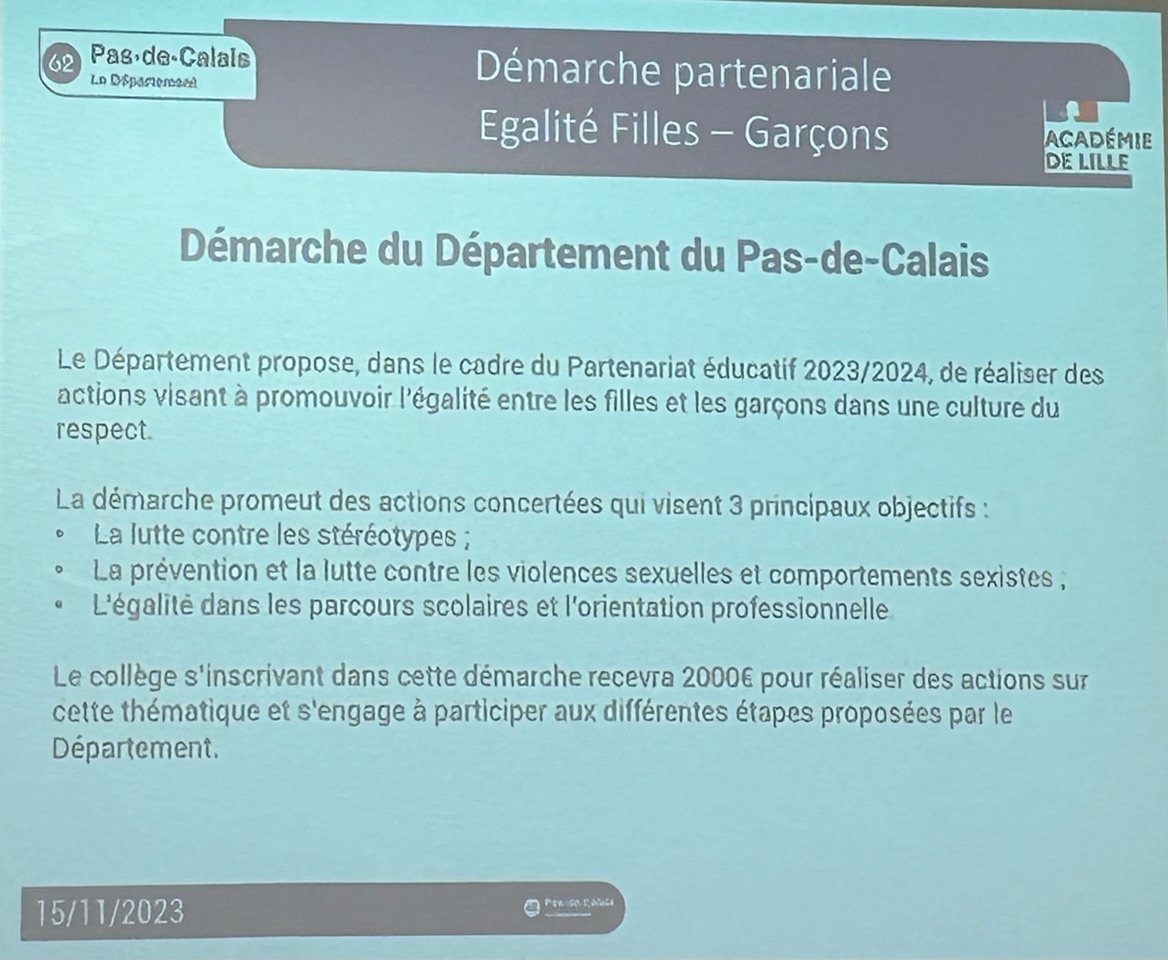 Dans le cadre du partenariat éducatif départemental entre le Département du Pas-de-Calais et les collèges publics, une démarche partenariale autour de l’égalité filles-garçons a été lancée durant l’année scolaire 2023/2024 et est prolongée pour l’année scolaire 2024/2025. Pour le territoire de l'Artois (25 collèges autour de Béthune/Bruay-la-Buissière), 12 collèges ont répondu favorablement à cet appel.