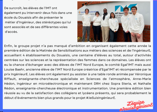 Le projet #JeSuisIngénieurE 2023-2024 a été mené par un groupe d'élèves de l'IMT Nord Europe composé de :