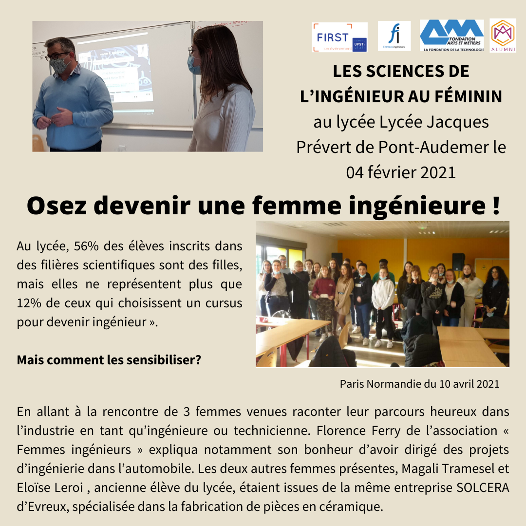 En allant à la rencontre de 3 femmes venues raconter leur parcours heureux dans l’industrie en tant qu’ingénieure ou technicienne. Florence Ferry de l’association « Femmes ingénieures » expliqua notamment son bonheur d’avoir dirigé des projets d’ingénierie dans l’automobile. Les deux autres femmes présentes, Magali Tramesel et Eloïse Leroi , ancienne élève du lycée, étaient issues de la même entreprise SOLCERA d’Evreux, spécialisée dans la fabrication de pièces en céramique.