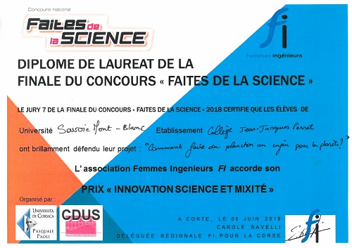 Le 8 juin 2018, la finale de la 13ème édition du concours "Faites de la science" dont Femmes Ingénieures est partenaire et qui est organisé sous l'égide de la Conférence des Doyens des Universités Scientifiques (CDUS) s’est déroulée à l’Université de Corse.