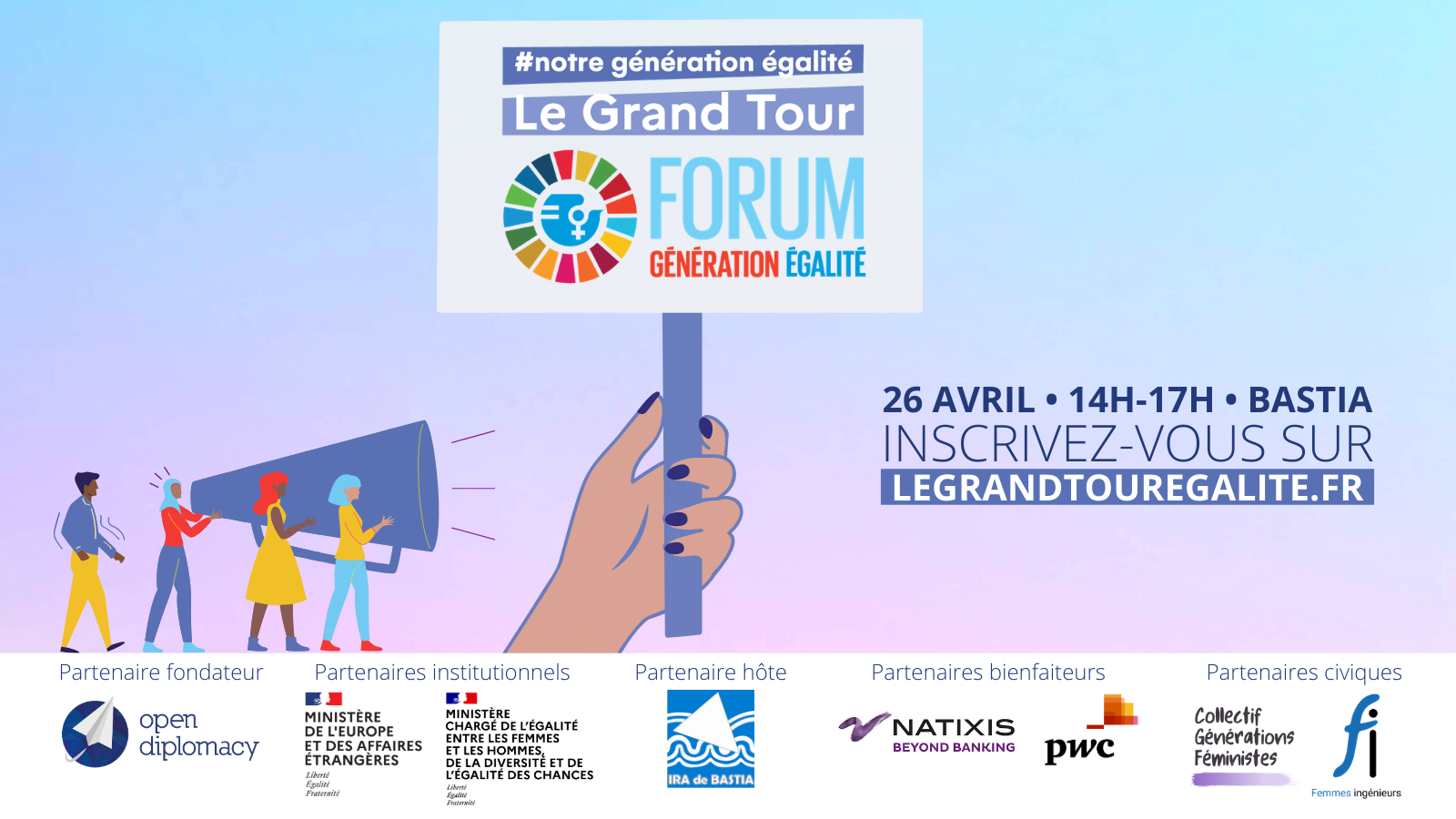 Le Ministre de l’Europe et des Affaires étrangères et la Ministre de l’Egalité ont confié le mandat à l’Institut Open Diplomacy d’organiser un tour de France en amont du sommet, jalonné par des conférences consultatives dans chaque région : le Grand Tour #NotreGénérationEgalité EN PARTENARIAT AVEC Femmes Ingénieures.