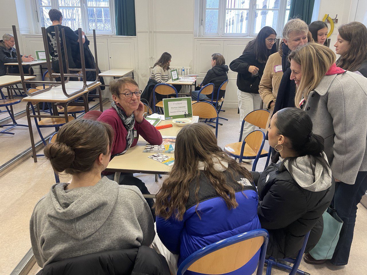 Ce 15 mai 2025, le collège Avon a organisé une action sur les stéréotypes de genres avec les élèves de 5eme au travers de la découverte des métiers. Notre association a été sollicité et ainsi avec une dizaine d’adultes professionnelles femmes qui occupent des métiers dits masculins, et des hommes qui occupent des métiers dits féminins, nous nous sommes prêtés au jeu de la découverte des métiers, uniquement sur le physique, par les élèves. Parmi les métiers : un monsieur « sage-femme », des pâtissières, des ingénieures, … L’activité était originale et très bien organisée . Merci aux organisateurs. À renouveler. Merci aussi à Andrée Steidel pour s’être libérée et avoir consacré une partie de sa journée à cette activité . Andrée et Michèle