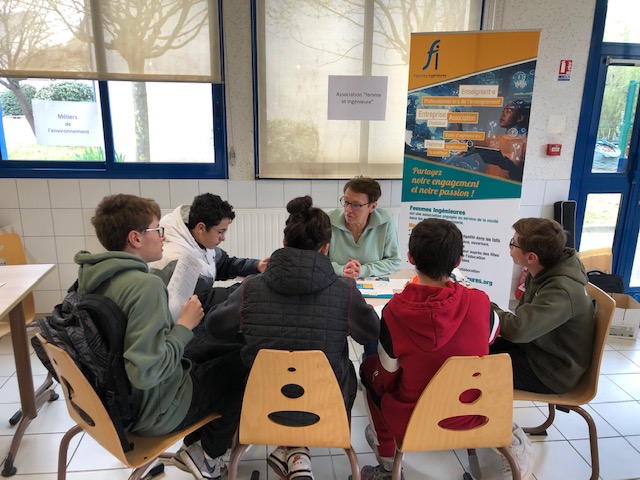 Basé sur ce constat, l’établissement a construit un projet annuel pour les élèves de 3emes, avec pour objectif d’inscrire les élèves comme acteurs de leur parcours d’orientation. Le collège a sollicité notre association Femmes Ingénieures et Elles Bougent pour participer à ce projet innovant. Nous étions 6 femmes dont Anne Garibaud et Michèle pour FI, avec des profils très différents et avons effectué une courte présentation de nos Métiers et nos parcours. Puis par petits groupes, les élèves nous ont interviewé et posé de nombreuses questions préparées a l’avance. Et enfin un débriefing avec l’ensemble des élèves a permis de dégager les points suivants :