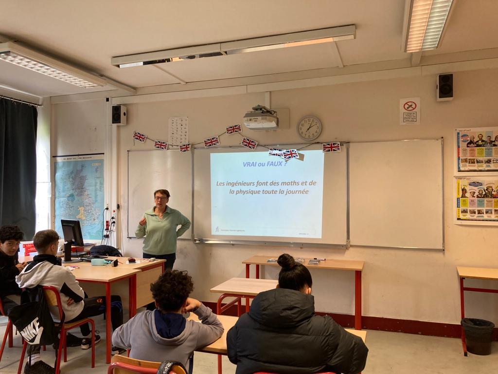 Ce 27 novembre 2025, à la demande de l’établissement, l’Association est intervenue dans ce Collège et j’ai rencontré 7 classes de 3emes soit 220 élèves. Les classes étaient regroupées 2 par 2 et chaque intervention se déroulait pendant 2 heures avec une petite pause au bout d’une heure. Durant ces 2 heures , j’ai présenté mon parcours scolaire , mes motivations pour les sciences et ma vie professionnelle . J’ai expliqué pourquoi je fais du bénévolat à l’association Femmes Ingénieures et les différentes activités de l’association. J’ai également présenté la grande diversité des secteurs d’activités, les différents métiers que l’on peut exercer avec un seul diplôme d’Ingénieur, le type d’étude à réaliser, les différentes possibilités ( alternance , BUT …), les moyens (bourse) Également les salaires, la féminisation de ce métier et le besoin crucial en Ingénieurs. Puis a partir de slides très interactifs, nous avons parcouru plusieurs secteurs d’activités et le but est de montrer aux élèves que de nombreux ingénieurs sont présents par leurs réalisations, partout autour de nous, mais la plupart du temps nous ne savons pas ce qu’ils font : Innover, réaliser, améliorer, maintenir , commercialiser , gérer des équipes …. Et bien sûr des messages pour convaincre les filles que ces métiers c’est aussi pour elles. Nous avons eu de nombreux échanges avec les élèves, et leurs professeurs également. J’espère que cette journée bien remplie aura permis aux élèves de découvrir nos métiers et leur donnera envie d’apprendre les sciences.