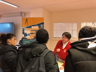 La plupart des stands étaient tenus par des anciens du lycée, étudiants ou jeunes travailleurs, et les jeunes élèves étaient très à l’aise avec leurs aînés. FI a rencontré une vingtaine de jeunes filles, hésitantes pour certaines, des enseignantes et le proviseur et avons échangé sur le faible taux de filles sur les stands Sciences et Technologies. Tout le monde ( y compris les élèves) s’accorde à dire qu’il faut faire encore plus de promotion pour les métiers d’Ingenieurs, trop peu connus.