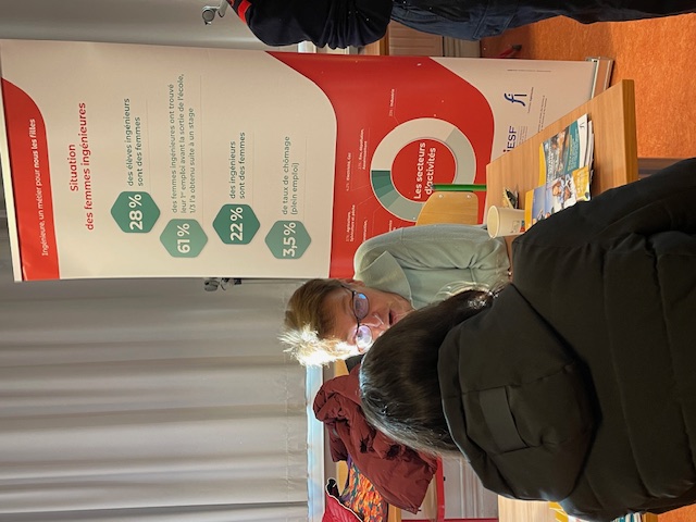 Ce 29 novembre 2025, l’association a participé au Forum des Métiers au lycée Jean Mace avec Corinne BOSCAND, Catherine GIBERT et Anne LUMBROSO. Peu d’élèves se sont intéressés à notre stand, pourtant bien riche en matériel. Cette année le lycée a organisé une intervention en amphi, qui a eu plus de succès. Corinne et Catherine y ont participé et ont présenté leur métier, leur parcours avec aussi Nicolas, un ancien de ce lycée aujourd’hui à l’Ecole des Ponts et Chaussées. Une 50aine d’élèves dont 5-10 filles ont assisté, et en pratique sont venus ceux qui avaient eu cours de SI en seconde. Il y a eu beaucoup de questions et en fin d’intervention, une jeune fille nous a dit avoir été convaincue par notre présentation du métier d’ingénieure. Bravo à nos intervenantes. Corinne, Catherine, Anne et Michèle