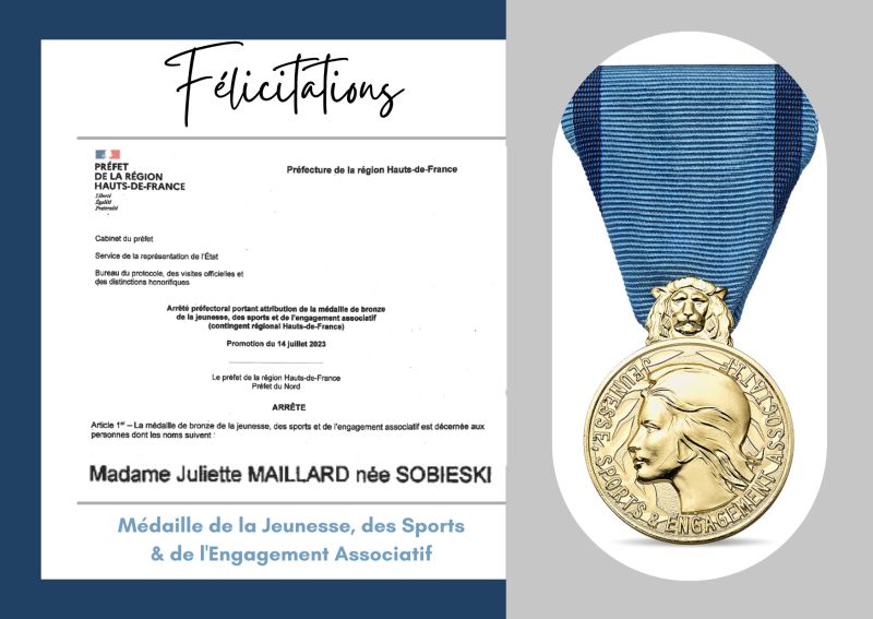 TEAM SPIRIT - L'Esprit d'Equipe félicite chaleureusement et sincèrement Juliette Maillard Sobieski, dirigeante de INUKSHUK et membre de notre Alliance, pour sa nomination dans la promotion du 14 juillet 2023 de la médaille de la Jeunesse, des Sports et de l'Engagement Associatif.