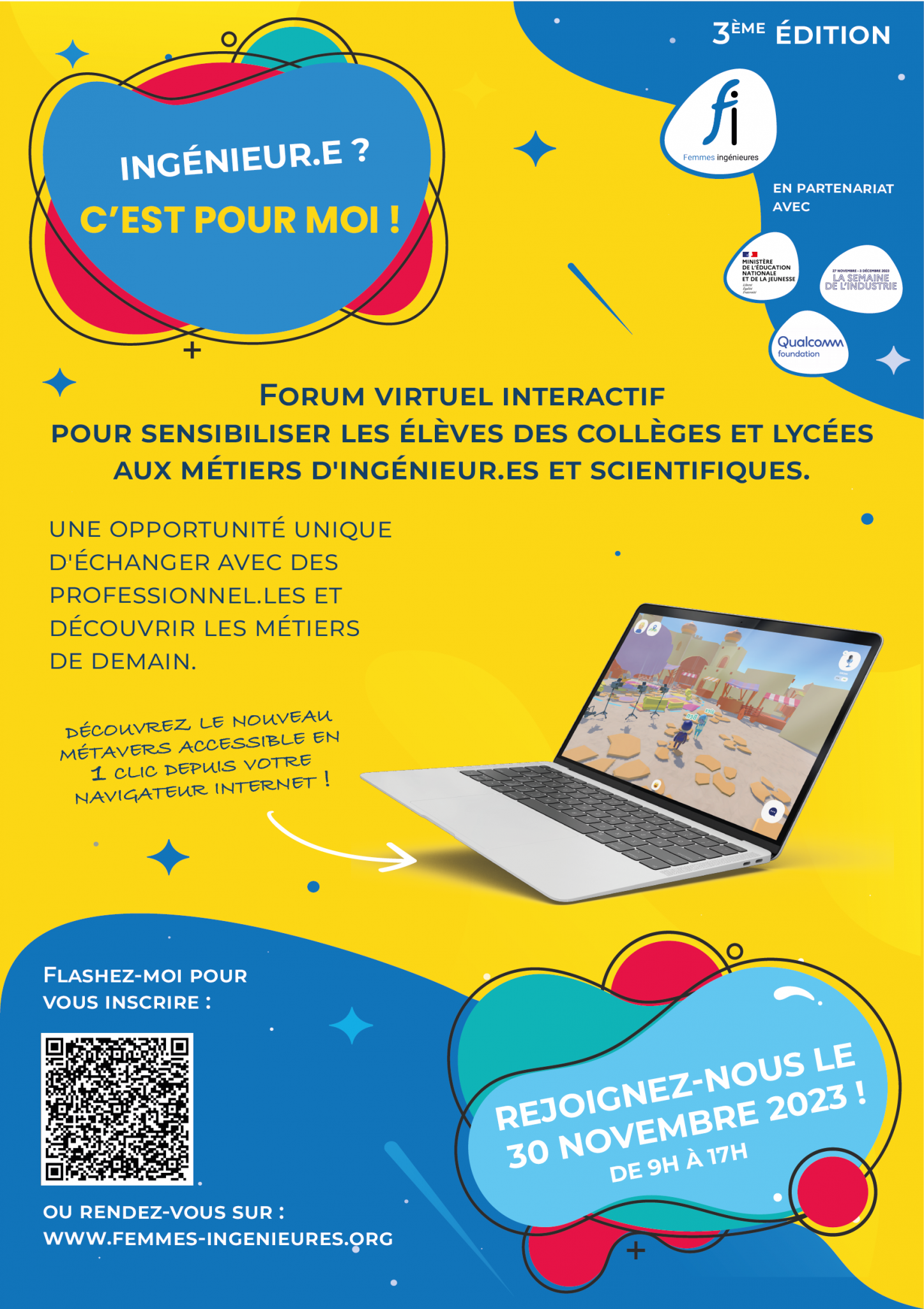 "Ingénieur.e ? C'est pour moi !", labellisé « La Semaine de l’Industrie », est une initiative qui a pour mission d'encourager et d'inspirer la prochaine génération d'ingénieur.e.s. Cette année, notre forum se déroulera dans un tout nouveau métavers, offrant une expérience immersive instantanée, accessible en un seul clic depuis votre navigateur internet. Les visiteurs sont représentés par leurs avatars qui se déplacent d’un espace à un autre, pour assister à des présentations thématiques et avoir des interactions avec les professionnel.le.s et des étudiant.e.s de l’ingénierie.