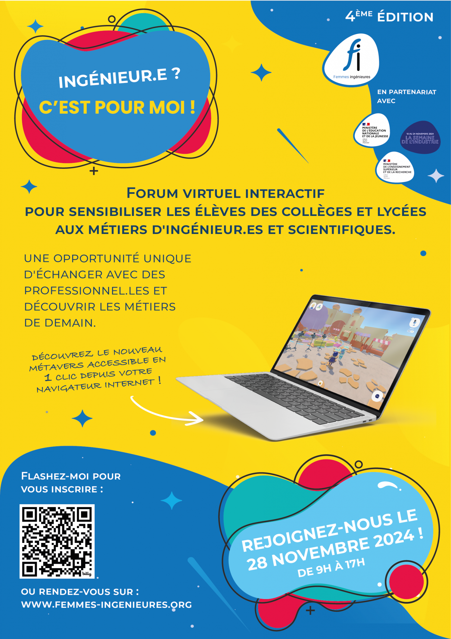Femmes Ingénieures a le plaisir de vous inviter à la 4 ème édition du forum virtuel « Ingénieur.e ? C’ pour moi ! » qui se déroulera le 28 novembre 2024