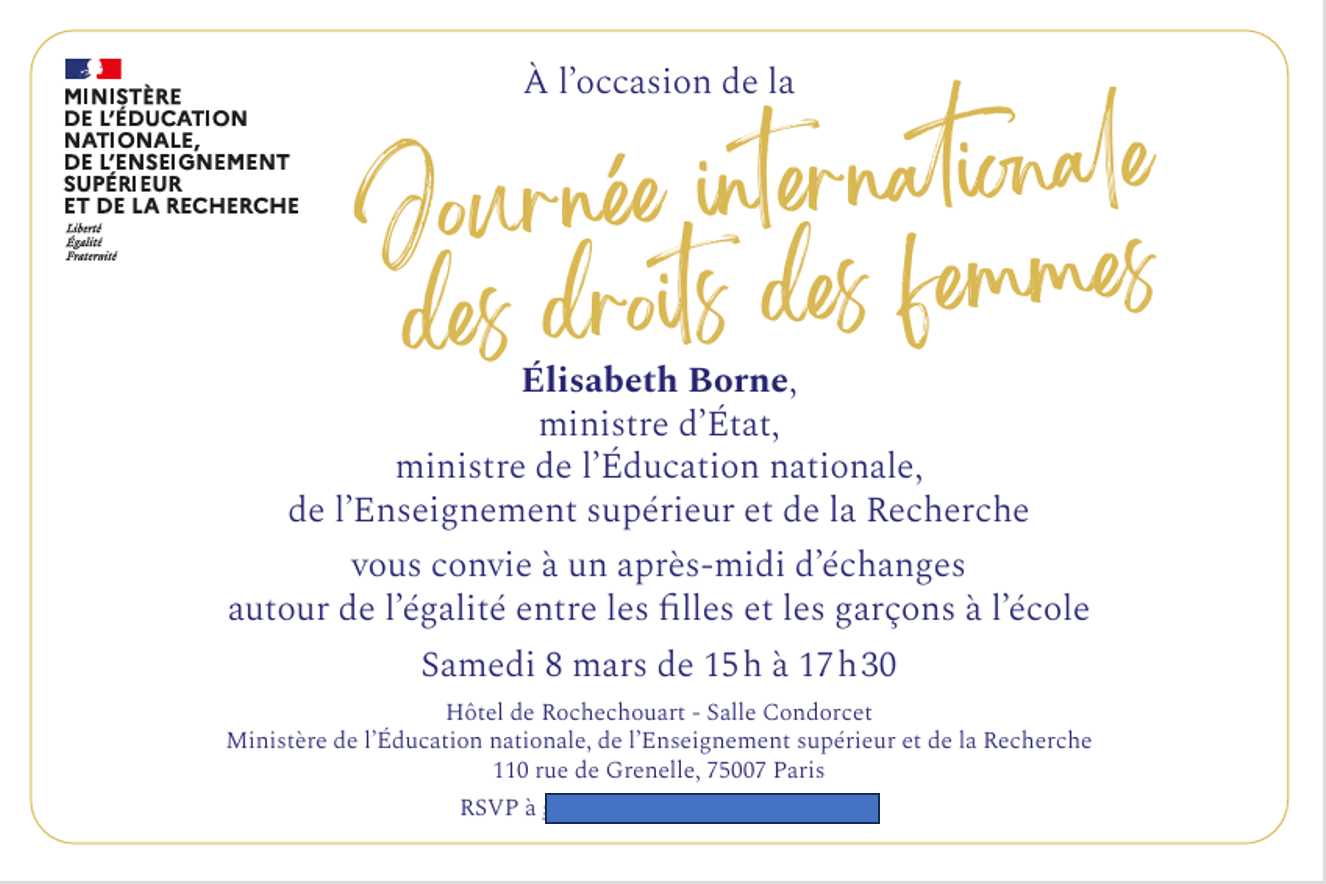 Ce 8 mars 2025, pour la première fois, le ministère de l'Éducation nationale organisait un événement en petit comité, dédié à l'égalité entre filles et garçons à l'école. Merci à Élisabeth Borne, Ministre de l'Education Nationale, de l'Enseignement Supérieur et de la Recherche pour cette invitation.