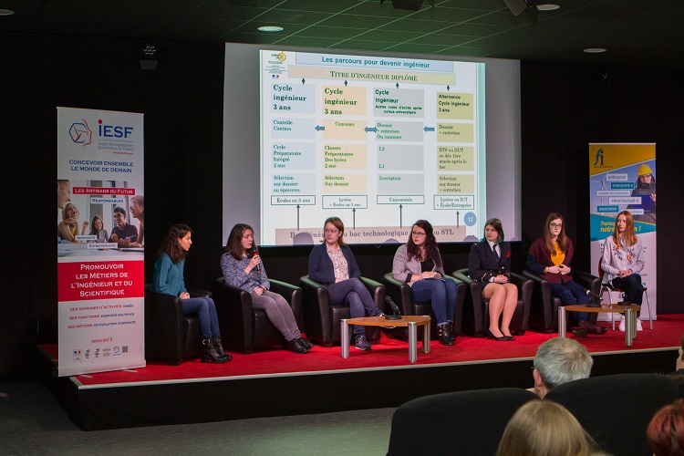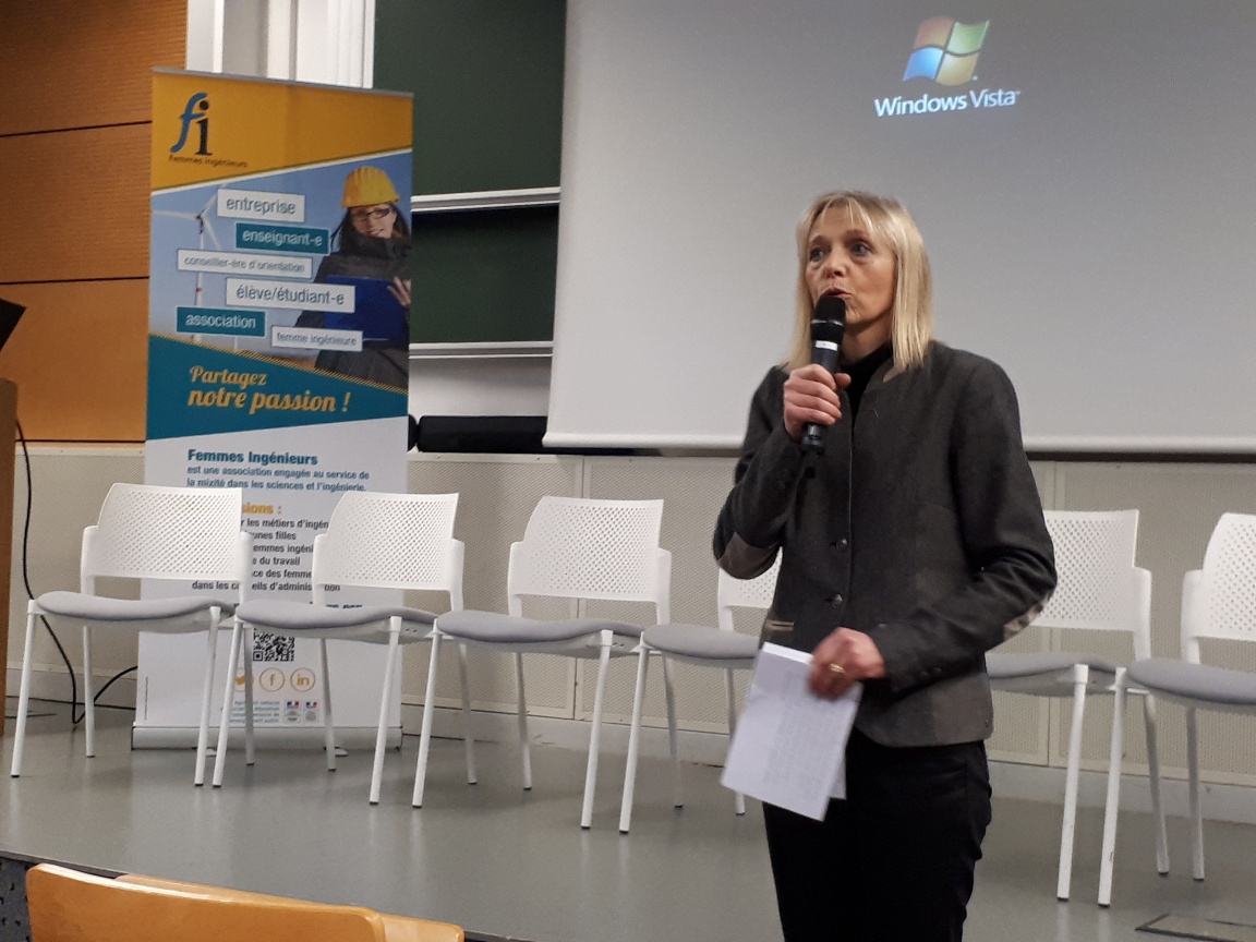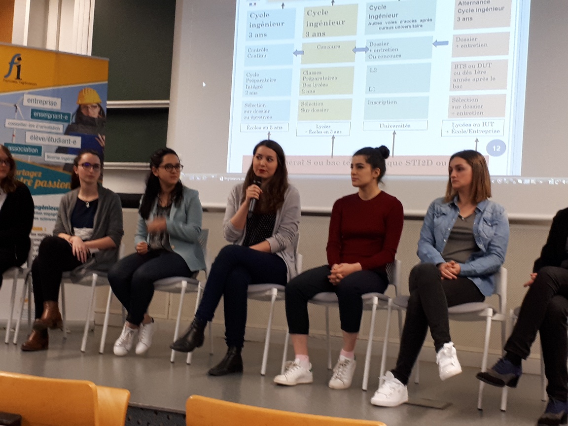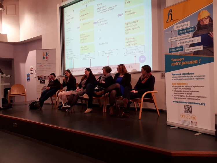 Ensuite Isabelle Hennebique ou Juliette Maillard-Sobieski, Déléguées régionales de Femmes Ingénieures ont animé la table ronde des ingénieures en activité dans différents secteurs industriels (énergie, ferroviaire, défense, automobile, agro-alimentaire, recherche ,environnement, informatique.... ) ou dans le secteur tertiaire ( aide aux entreprises) qui ont pu partager avec les jeunes filles présentes