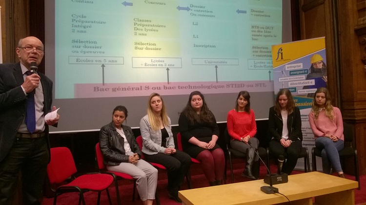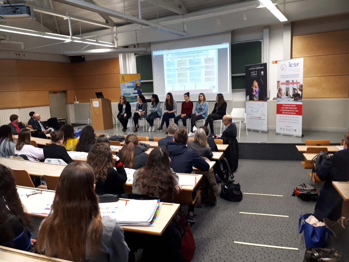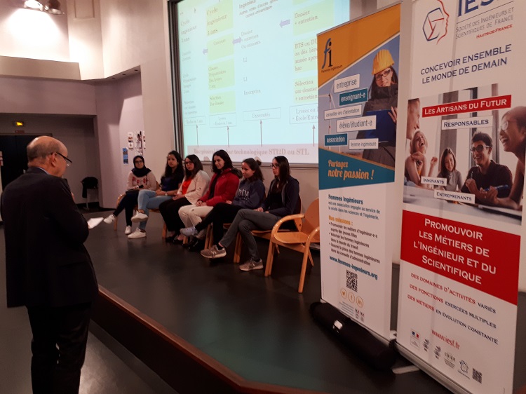 Après quelques mots d'introduction des directeurs des écoles qui nous accueillent, de Mme Sandrine Benafquir du rectorat de Lille et d'une rapide présentation de quelques chiffres significatifs sur les résultats des jeunes filles dans les filières et matières scientifiques, Jean Claude Gentina, président d'IESF Hauts de France donne la parole à aux étudiantes des écoles d'ingénieur.e.s de la région. Elles ont évoqué