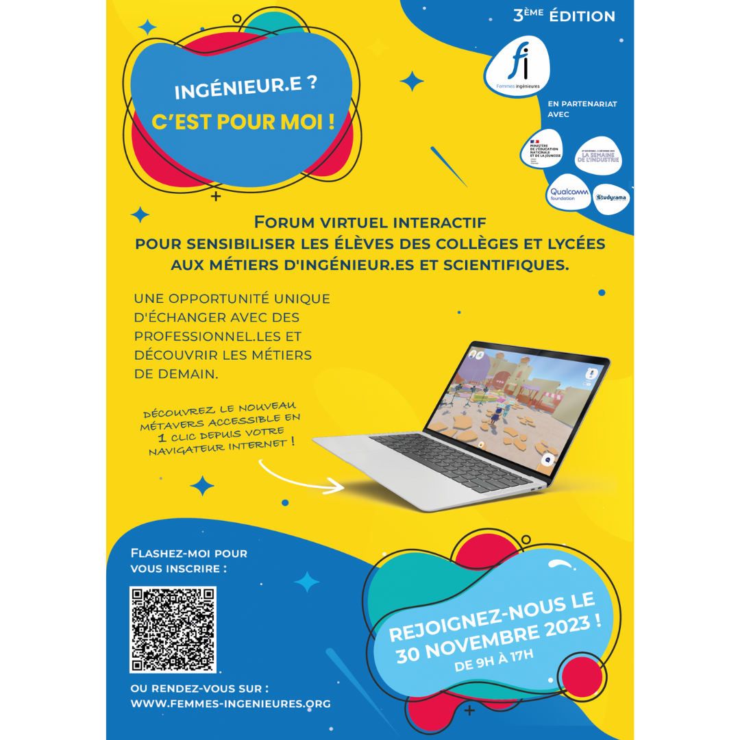 "Ingénieur.e ? C'est pour moi !", labellisé « La Semaine de l’Industrie », est une initiative de Femmes Ingénieures qui a pour mission d'encourager et d'inspirer la prochaine génération d'ingénieur.e.s. Cette année, notre forum se déroulera dans un tout nouveau métavers, offrant une expérience immersive instantanée, accessible en un seul clic depuis votre navigateur internet. Les visiteurs sont représentés par leurs avatars qui se déplacent d’un espace à un autre, pour assister à des présentations thématiques et avoir des interactions avec les professionnel.le.s et des étudiant.e.s de l’ingénierie.