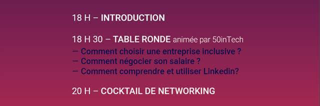 Cette édition est organisée en partenariat avec 50inTech, réseau de femmes dans la tech, qui animera une table ronde sur la négociation salariale.