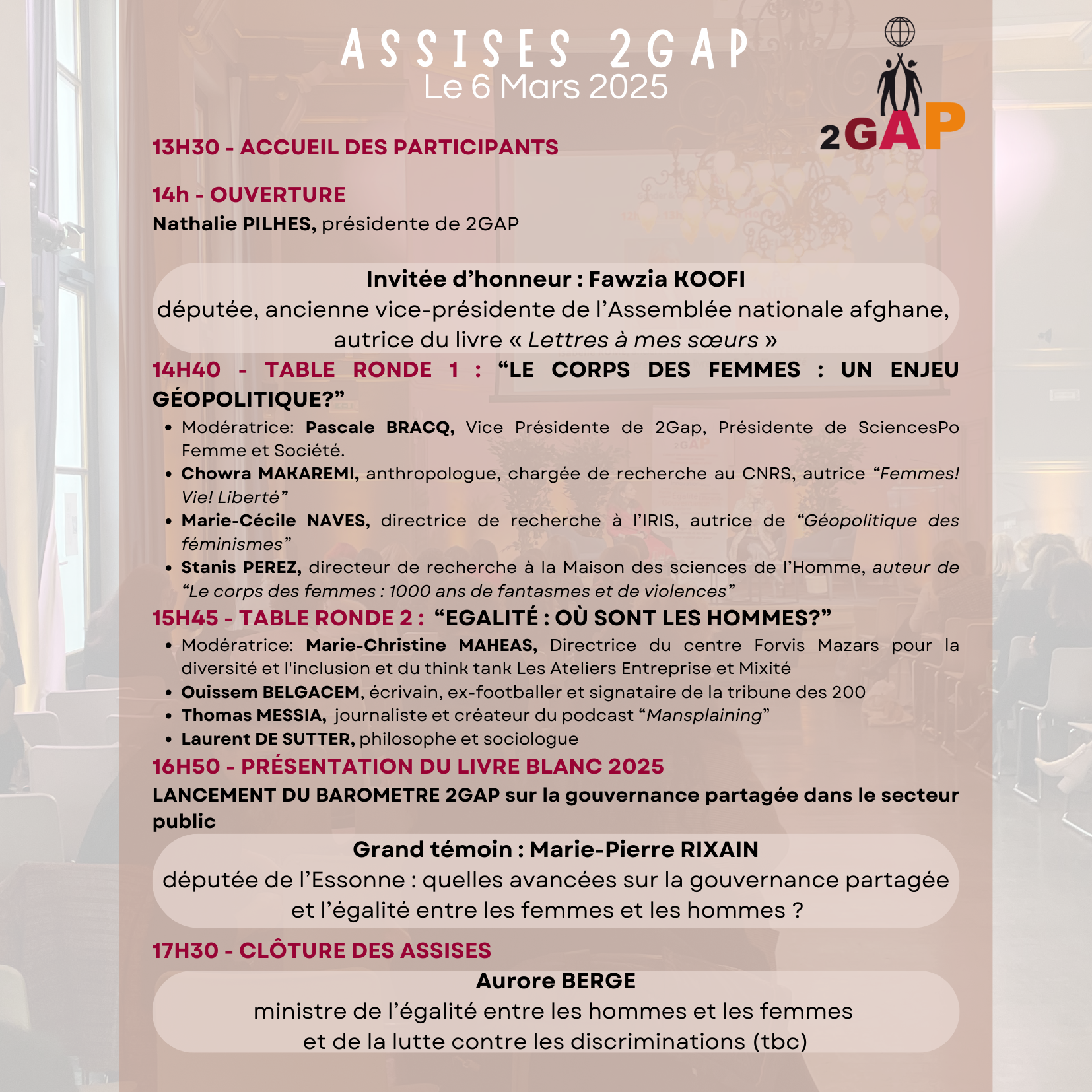 Enfin la journée sera clôturée par Aurore Bergé, Ministre déléguée chargée de l'Égalité entre les femmes et les hommes et de la Lutte contre les discriminations suivi d’un cocktail pour célébrer les 5 ans de 2GAP.