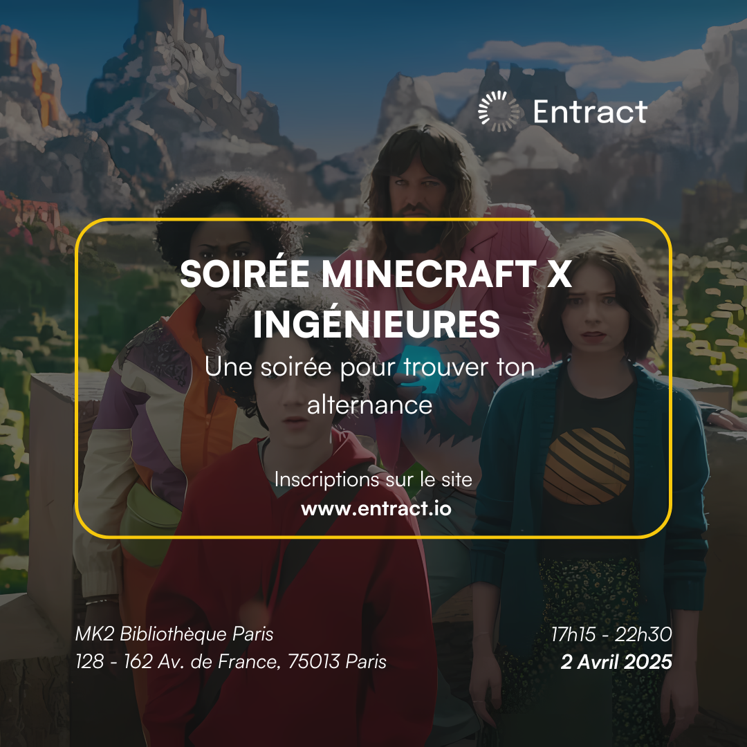 Nous avons le plaisir de vous inviter à participer à une soirée de recrutement dédiée aux élèves Ingénieures en recherche d’alternance (contrat d'apprentissage, de professionnalisation) et de stages organisée par Entract. Quelques propositions de CDI également. Cet événement se tiendra le 2 avril, à partir de 17h30, au MK2 Bibliothèque à Paris, 128 - 162 Av. de France, 75013 Paris.