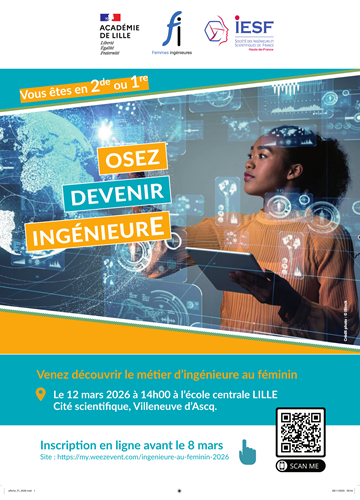 une conférence qui vous permettra après une introduction par le rectorat de l'académie de Lille d'écouter les témoignages d'élèves ingénieures et d'ingénieures en activité qui vous parleront les premières de leurs études et de la vie en école d'ingénieurs et les secondes de leur métier.